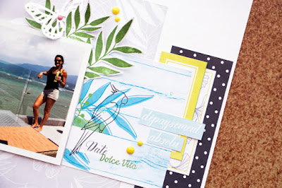 Aujourd'hui, je vous propose une page avec un peu de patouille… Oui, oui, vous lisez bien de la "patouille". J'ai eu envie de me "réessayer" au fond de page un chouia travaillé avec un peu de peinture et des tampons.